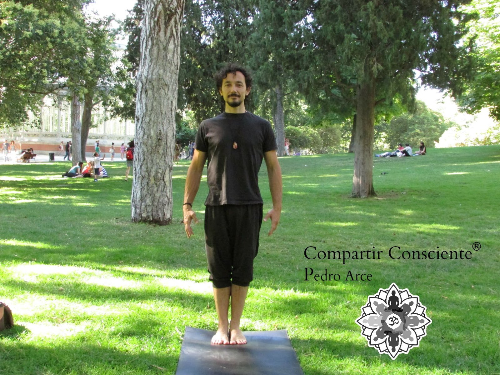 Espalda recta. Desde coxis hasta cervicales. Hombros bajos con brazos relajados. Axilas sueltas para no cortar el flujo de energía. Coronilla tirando ligeramente hacia arriba. Peso del cuerpo equilibrado que se proyecta por partes iguales en la zona interna de la planta de los pies. Desplazando el peso ligeramente hacia delante.